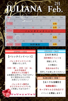 ども☆ 2026年始まって早いものでもう2月〜 ジュリアナの2月はこんな感じ✨✨ 2月のイベントカレンダー📆 9日(月) 〜 14日(土) ✨💝バレンタインイベント💝✨ 良かったら貰いに来てくださいな🥺✨ 24日(火) 〜 26日(木) ✨🍴同伴無料イベント🍴✨ 是非②お誘い待ってます🍴🥹✨ 2月もジュリアナをよろしくお願いします・:*+.\(( °ω° ))/.:+ ではまた☆